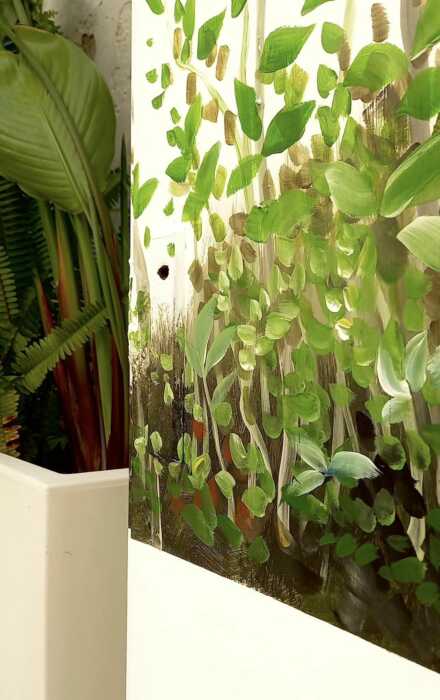 Un effetto ottico che quasi pare un miraggio, essendo oltretutto la cassetta ENEL apposta in mezzo a due vasi di piante, prospettiva che rende questa visione un continuum e crea una liturgia tra realtà e finzione immaginifica.